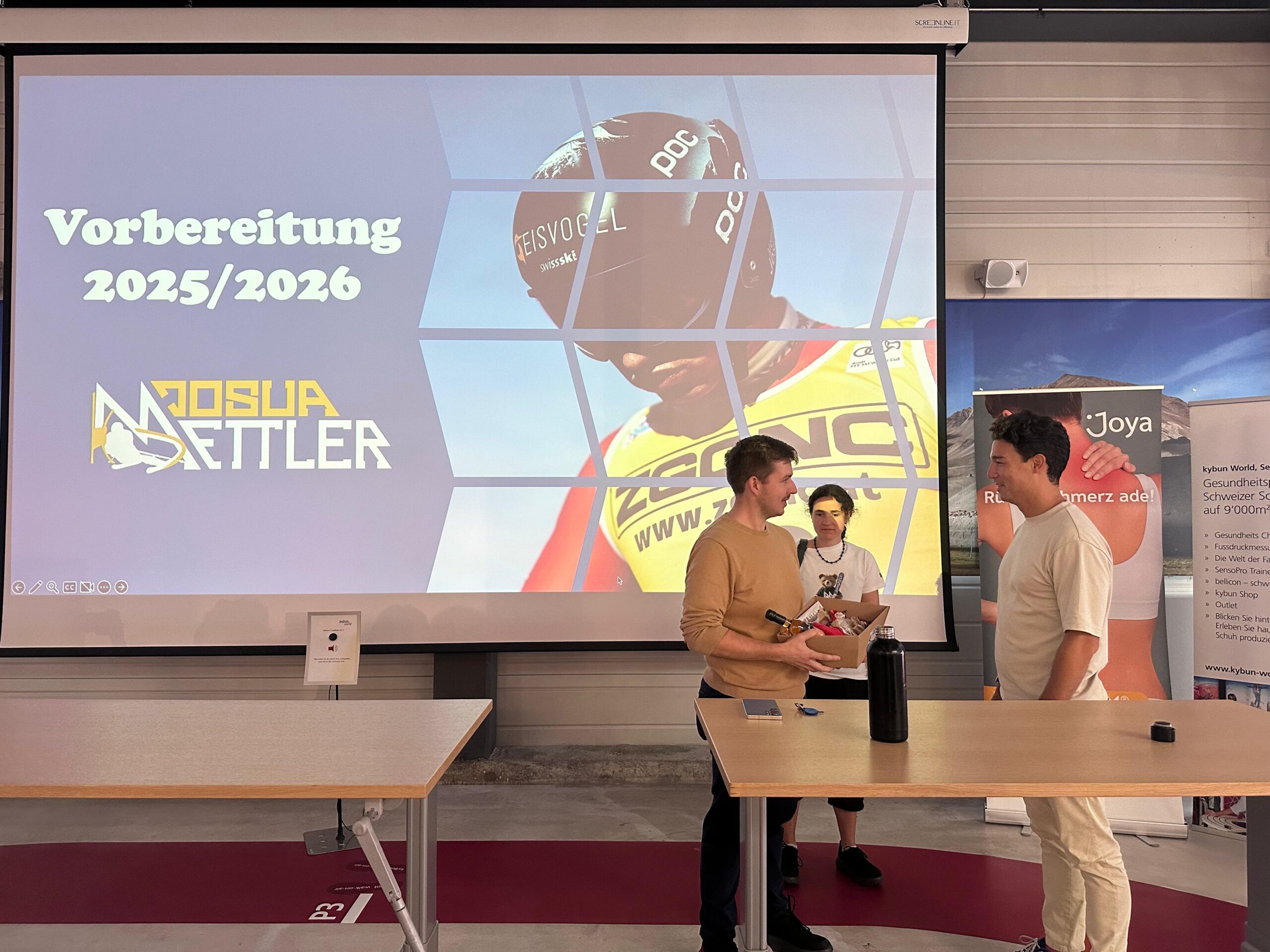 Josua war ebenfalls vor Ort. Er erzählte uns von seiner Reha und der Vorbereitung. Es sieht gut aus! Schritt für Schritt geht es vorwärts. Letzte Woche war er auf dem Gletscher und könnte das erste Mal wieder Tore fahren. Er hat die Vorbereitung auch genutzt, um neue Sachen auszuprobieren und für das Mentaltraining.